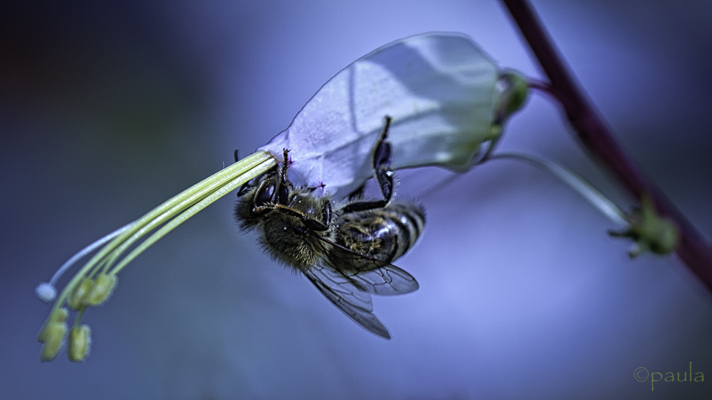 14. Astounding capture Paula. My first thought was that the be had amazing core strength to hang on like that. I expect they are built far better than humans for such work.