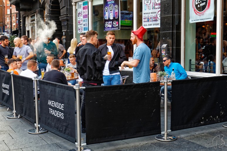 Contrary to what you might think, the oddball here is not the guy with a lamp shade on his head, but the guy drinking juice.